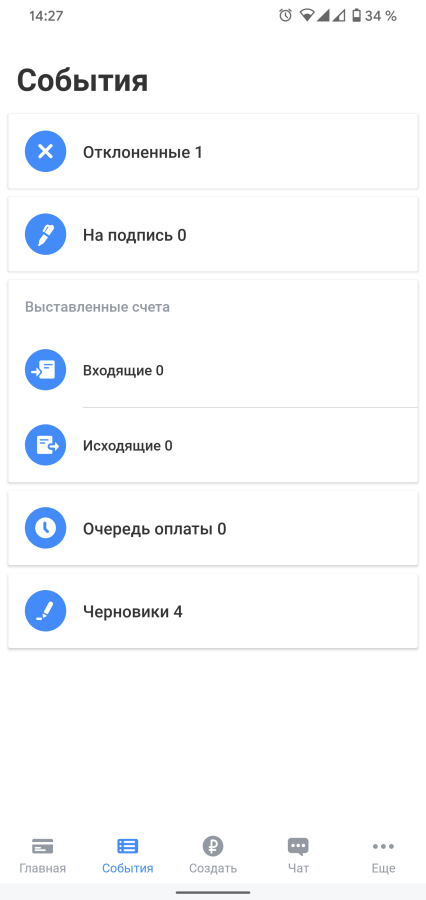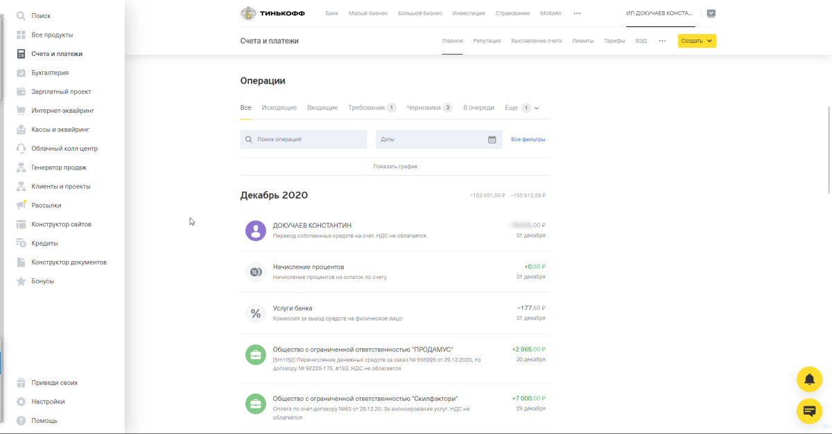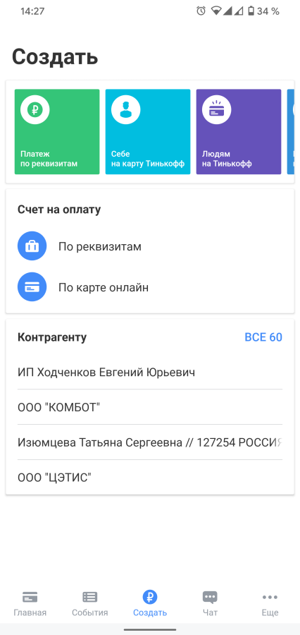 Рассказывать про базовые действия (типа выставления счетов, работы с контрагентами) я не буду. Всё есть, всё работает хорошо. А вот плюсом для клиентов Тинькофф (для частных лиц) будет быстрый переход к информации о сумме на вашей карточке банка. Хотя толку от этой информации мало.