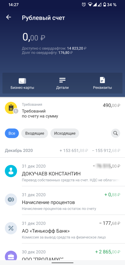 Для меня веб-версия Тинькофф всегда казалась громоздкой и непонятной. Да и большинство «физиков» пользуются мобильным приложением банка. В случае с бизнесом у меня точно такая же ситуация.