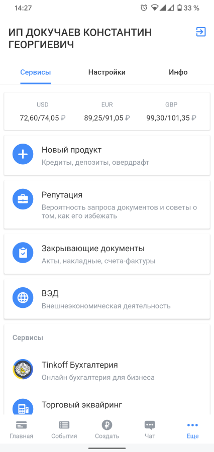 При открытии счёта вам автоматически будут предоставлены: онлайн-банк (как иначе), онлайн-бухгалтерия, карты для бизнеса, инкассация и самоинкассация, валютные счета и ещё немного по мелочи. Попробую рассказать обо всём понемногу.