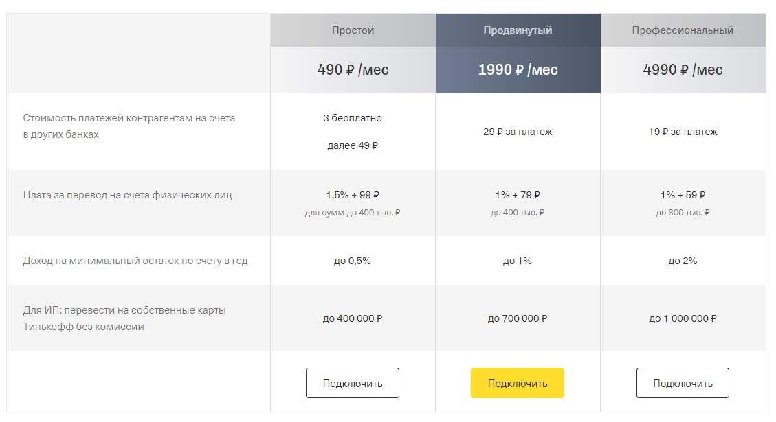 Сами тарифы включают и другие платные услуги. К примеру, 49 рублей — за платежи контрагентам в другие банки, оплату за переводы другим физлицам. В моём случае я плачу только 490 рублей, а вывод себе на карту в Тинькофф происходит мгновенно и без комиссий. А больше мне ничего и не нужно.