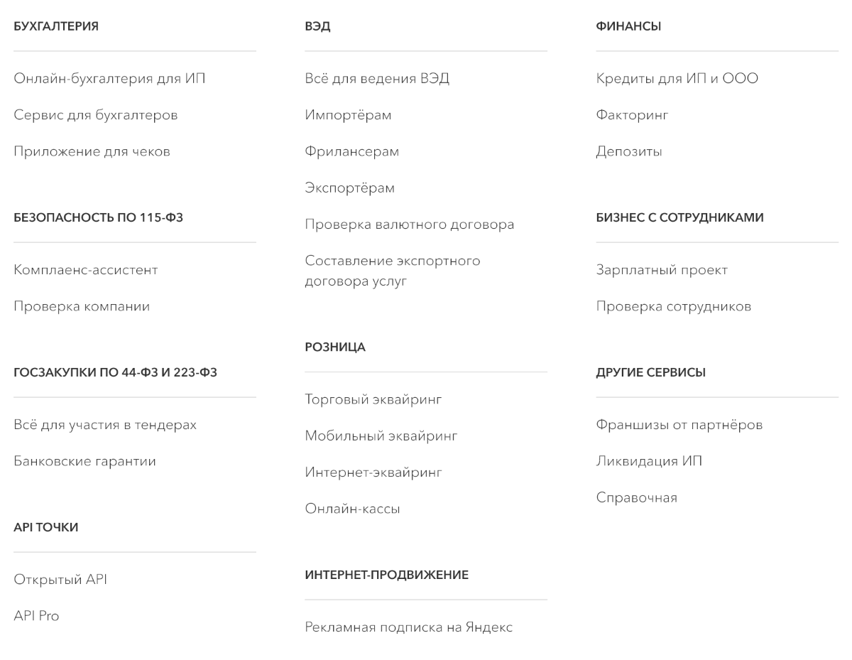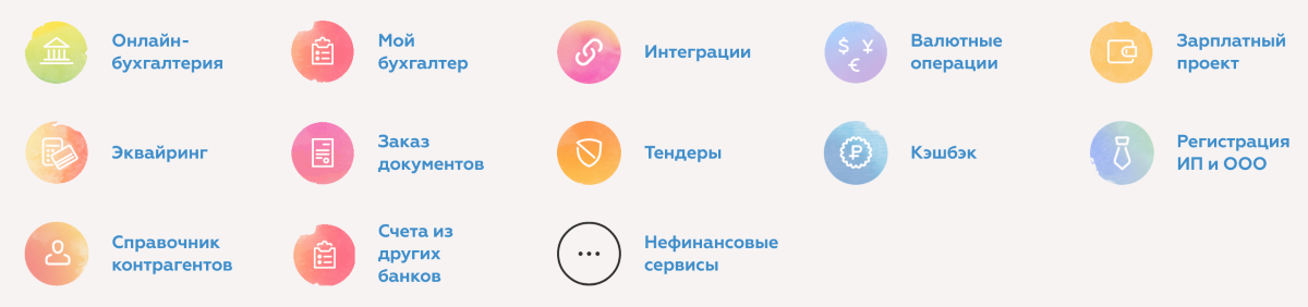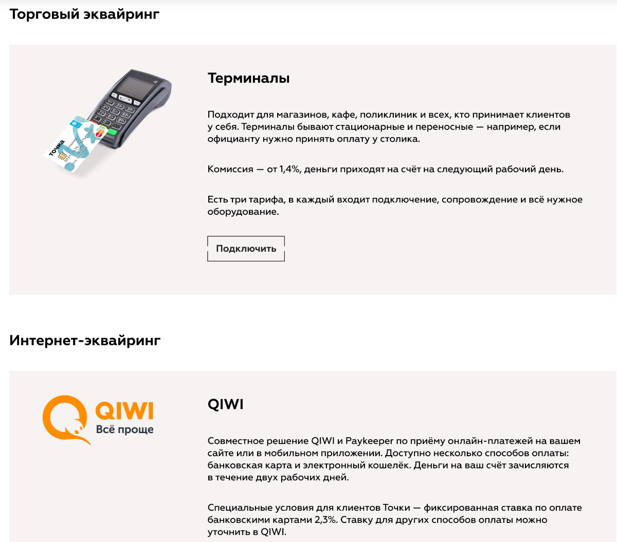 Первое, что выделяет Точку среди конкурентов — это большой набор различных сервисов и возможностей для любого типа бизнеса. Совершенно не важно, кто вы, — фрилансер, крупный предприниматель или соучредитель ООО. Банк предоставит нужный именно вам набор услуг.