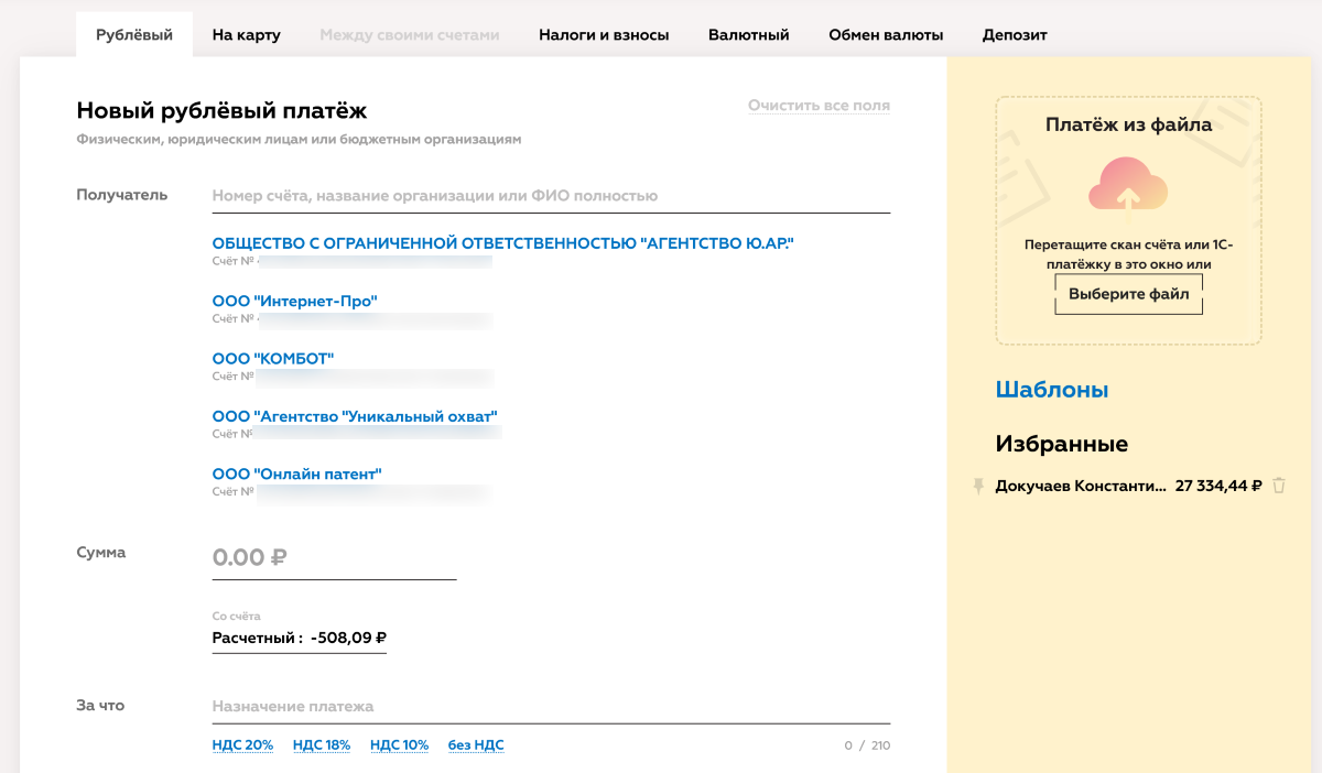 Есть возможность создавать свои шаблоны или оплачивать из файла-счёта. Можно выставлять счета или проводить безопасные сделки.