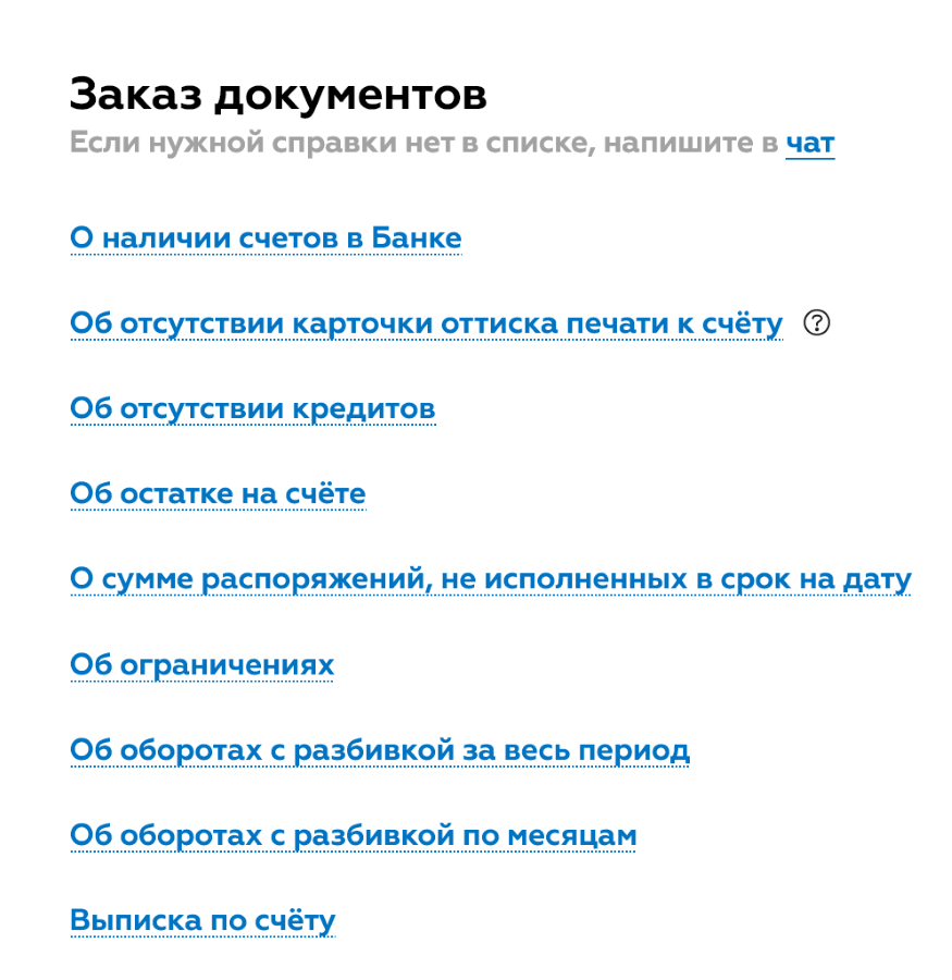 В разделе Заказ документов можно заказать любые необходимые документы: о наличии счетов в банке, об отсутствии карточки оттиска печати, кредитов и тому подобном.
