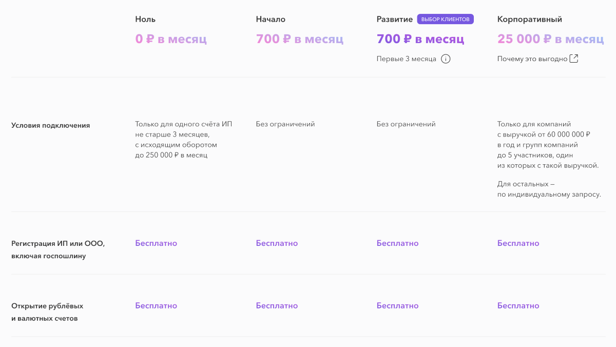 Тарифы на обслуживание начинаются от 0 рублей в месяц и доходят до 25 000 рублей. Основная разница между ними в суммах оборотов по различным категориям, процентам, ставкам и прочим финансовым мелочам.
