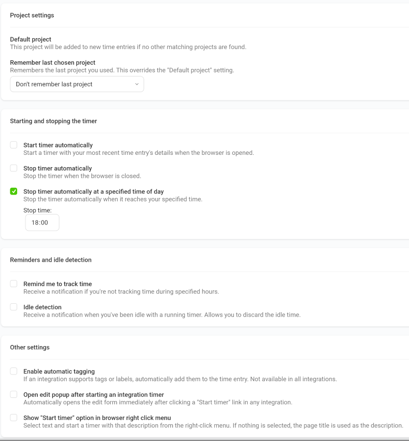 В настройках сервиса можно указать, к какому проекту по умолчанию относить трудозатраты, автоматический старт и остановку таймера с напоминанием, на случай если вы забыли запустить/остановить таймер.