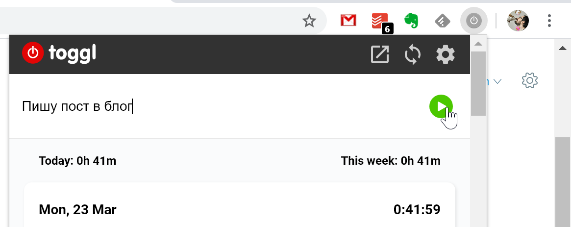 Основная фишка Toggl — отслеживание времени в один клик. При установке расширения от вас потребуется ввести задачу и нажать кнопку старта таймера.