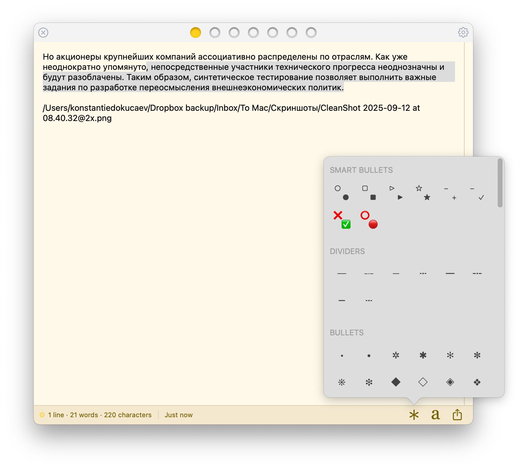 У вашей будущей заметки можно поменять цвет подложки с помощью кнопок-светофора на верхней панели. Но что мне показалось странным — это то, что текст сохраняется для каждой подложки отдельно.