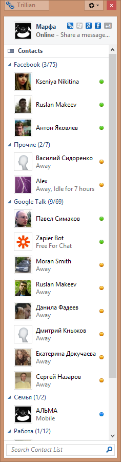 Trillian так же как и известный многим QIP поддерживает метаконткаты, т.ч. вы можете объединить несколько контактов в один. Все чаты можно так же отображать в одном окне независимо от используемого мессенджера: