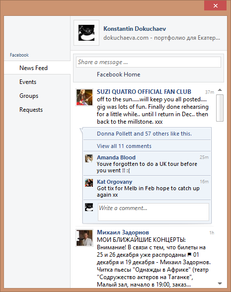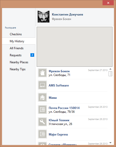 Так же Trillian позволяет получать уведомления от социальных сетей и практически полный доступ к их функциям. Вот, например, Foursquare: