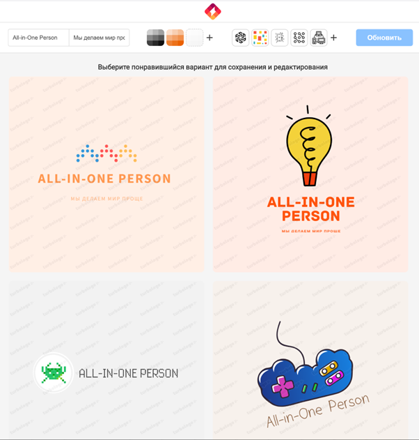 На следующем шаге вас наконец-то будут ожидать готовые варианты логотипа. Именно здесь сервис показывает свои уникальные дизайны.