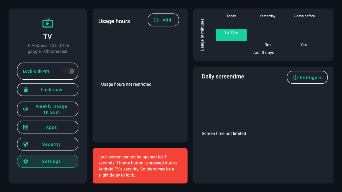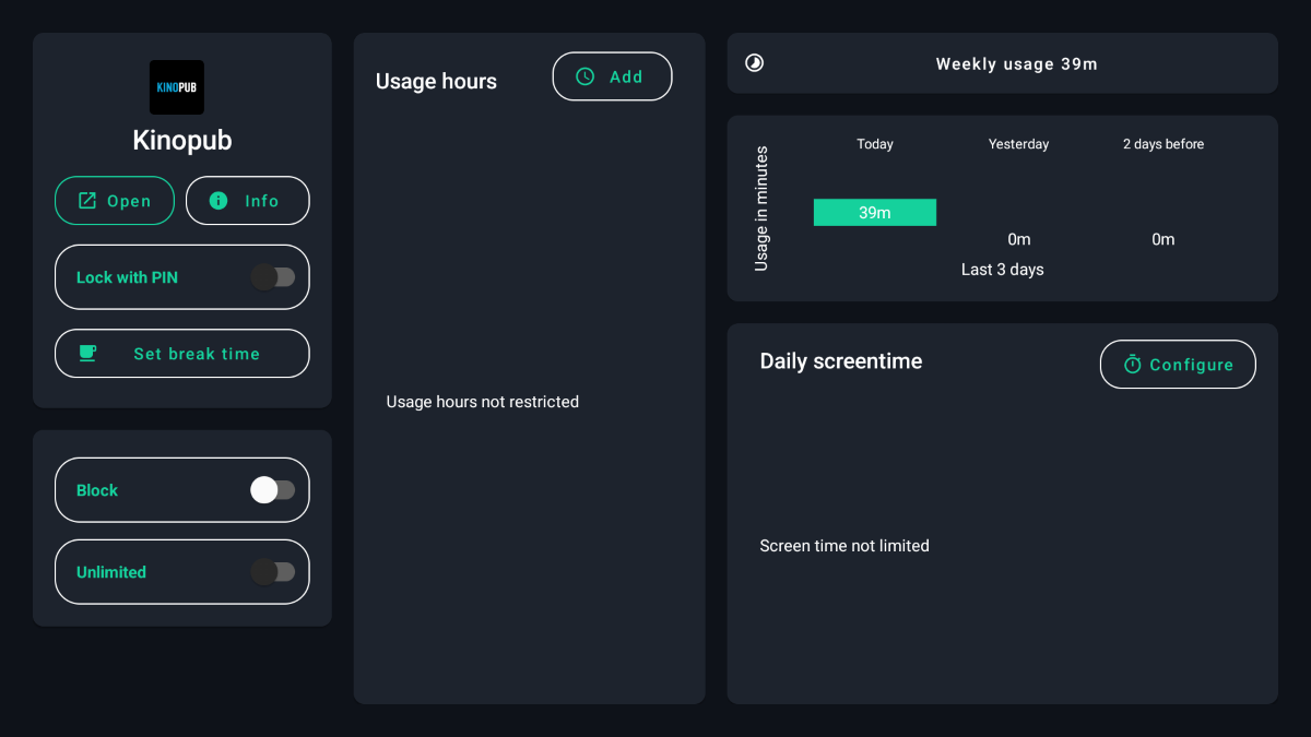 В настройках самого tvusage можно активировать просмотр статистики удалённо, добавить пин-код на запуск, запретить установку и удаление любых приложений, активировать предупреждения об истечении экранного времени.
