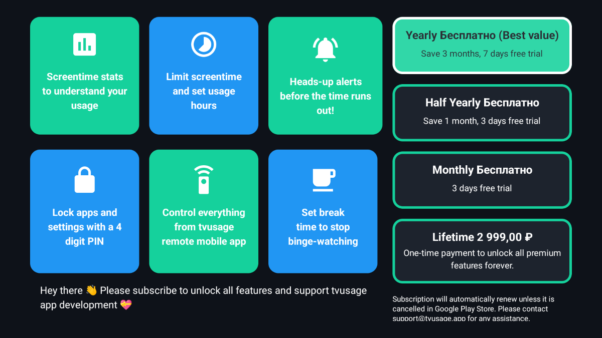Пользоваться tvusage можно бесплатно с определёнными ограничениями. За 2999 рублей можно разблокировать все функции навсегда, либо купить подписку на месяц, полгода и год. Подписка начинается от 99 рублей.