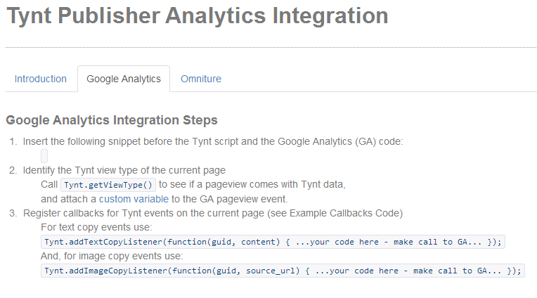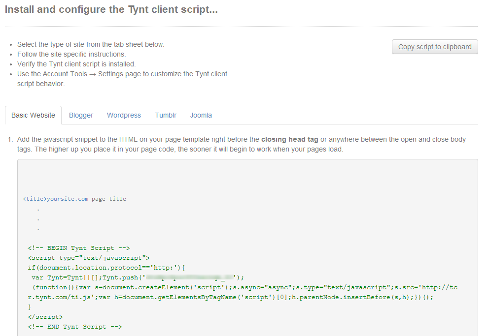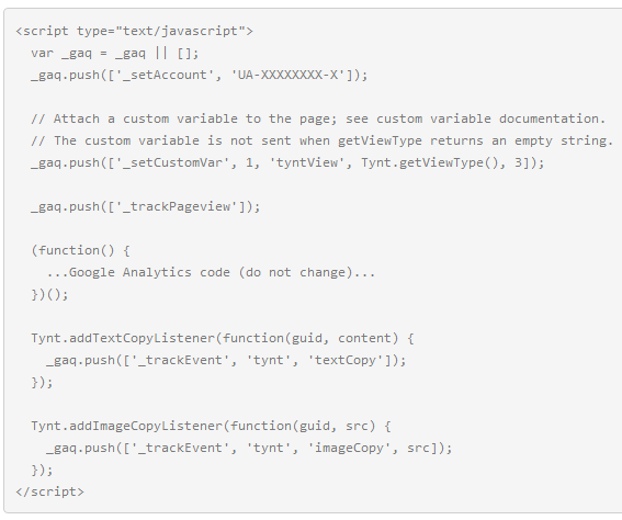 Вы можете скопировать указанный код и вставить его в любое место вашей страницы, но лучше всего это сделать перед тегом . Если вы уже используете Google Analytics, то вы можете использовать одновременно два скрипта, или встроить Tynt в аналитику от Google.