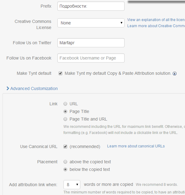 В настройках Tynt вы можете задать как именно будет выглядеть скопированный текст.