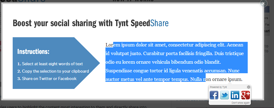 SpeedShare - это аналог кнопок поделиться. Пользователь выделяет текст, жмет копировать и ему сразу же предлагается поделиться текстом в Twitter, Facebook, LinkedIn, Google+ и Pinterest.