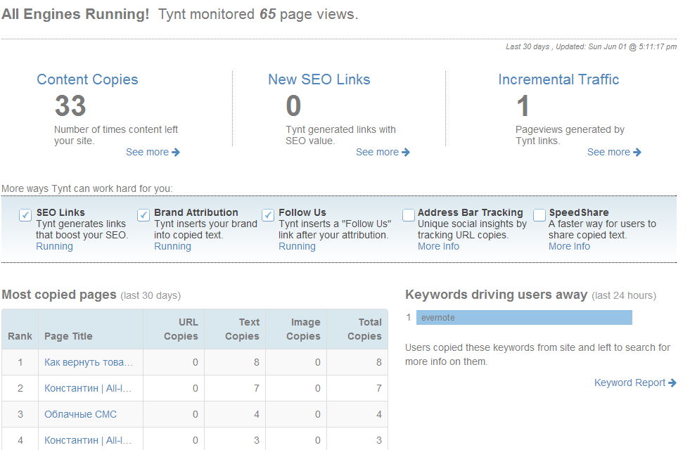 Tynt - инструмент веб-аналитики для издателей и SEO. Сервис позволяет отслеживать скопированный контент вашего сайта и ключевые слова.