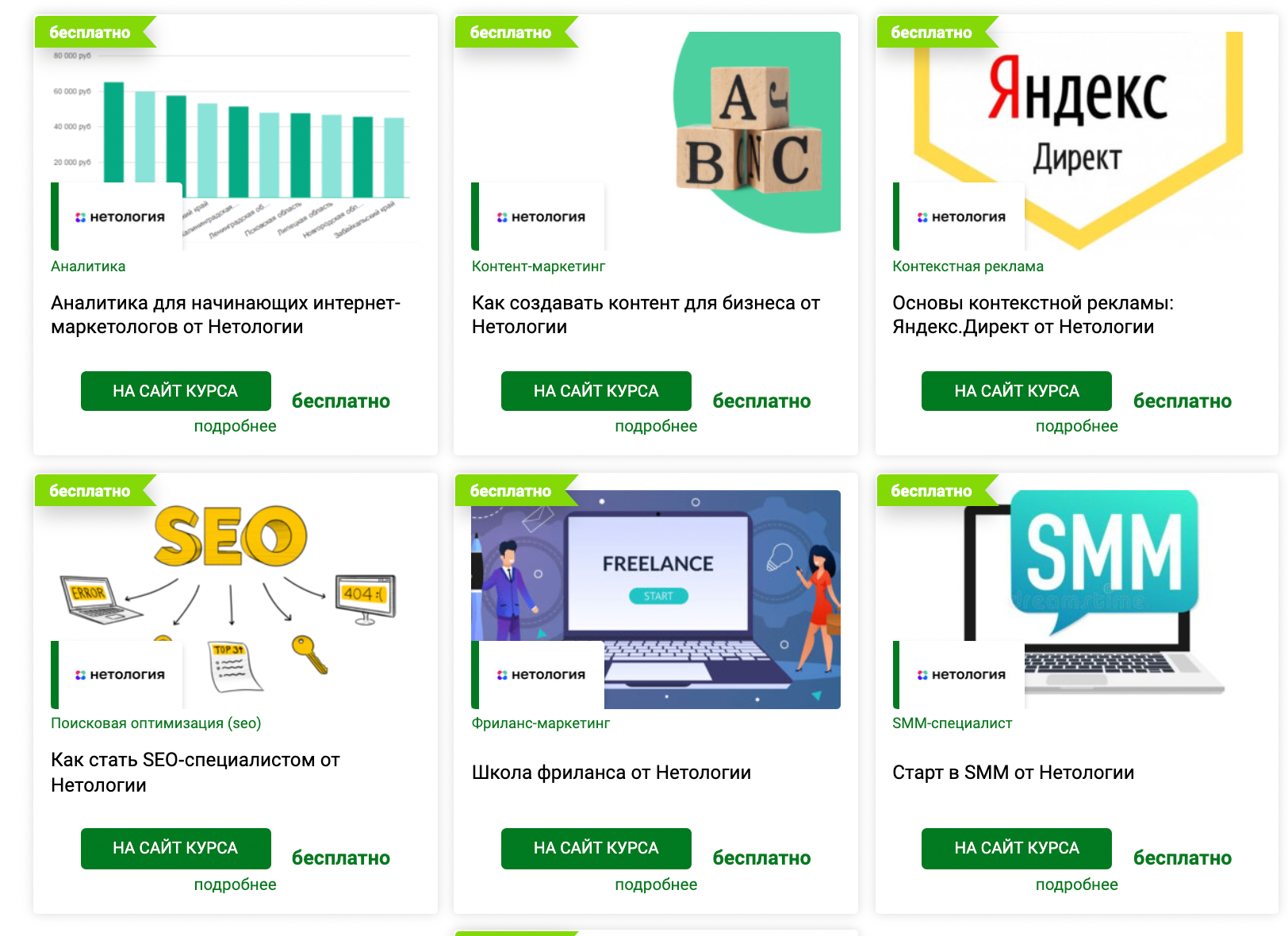Кому они могут быть полезны? Допустим, вы решили продвигать свой бизнес в соцсетях, но не уверены, что потянете это своими силами. Тогда вы заходите в раздел «Бесплатные курсы», выбираете курс «SMM с нуля» и пробуете. А дальше понимаете, хотите ли вы углубляться в тему или проще нанять специалиста.