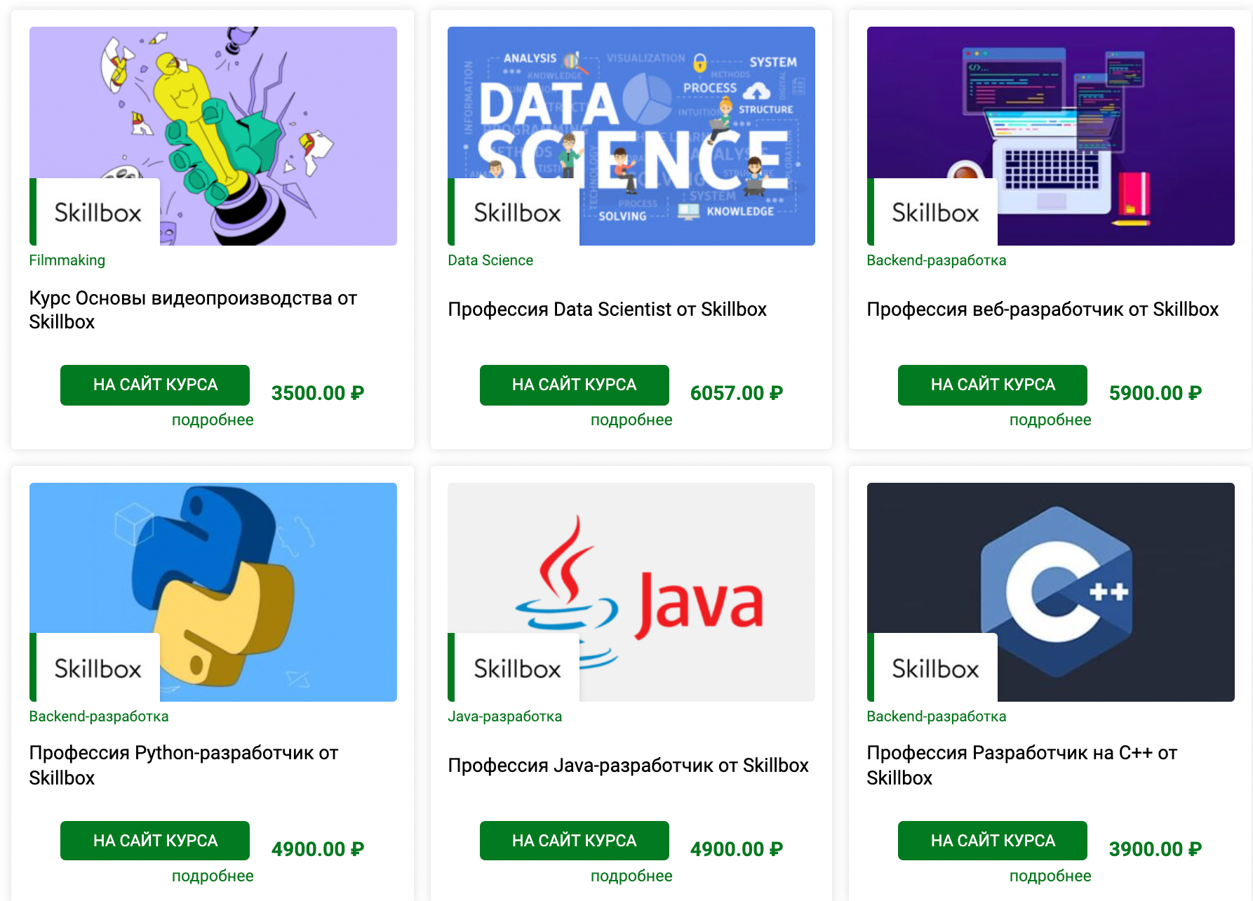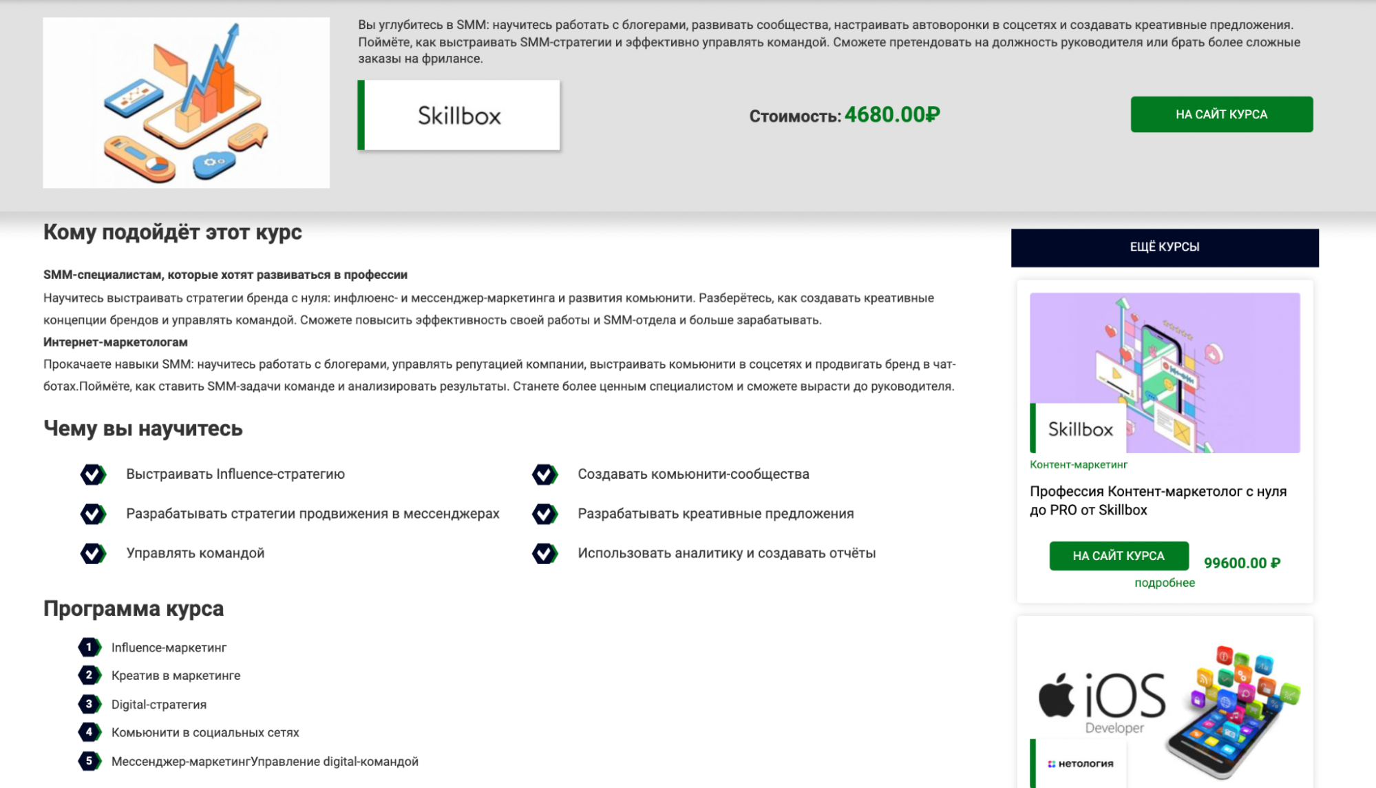 На страницах курсов вкратце рассказывают о навыках, которые можно приобрести в рамках обучения. Там же в один клик можно перейти на сайт самой образовательной программы.