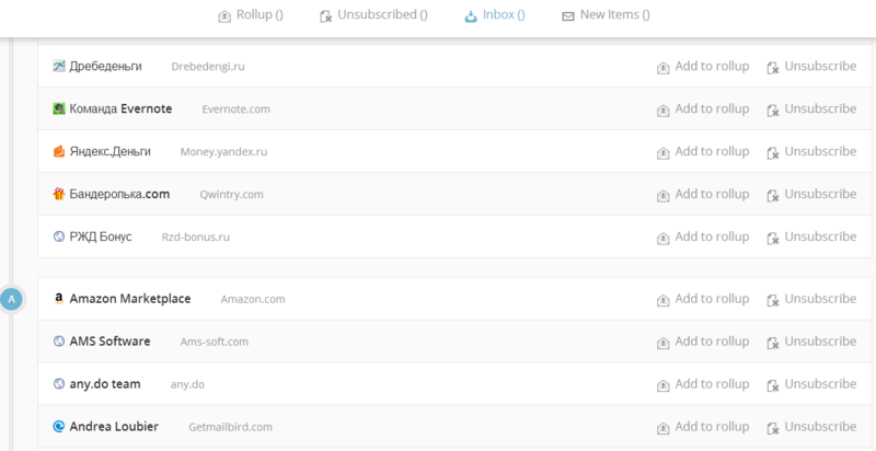 Из моего скриншота не видно, но обычно там три кнопки: Add to rollup, Unsuscribe и Keep Inbox. Все эти кнопки отвечают за то, что в дальнейшем случится с рассылкой.