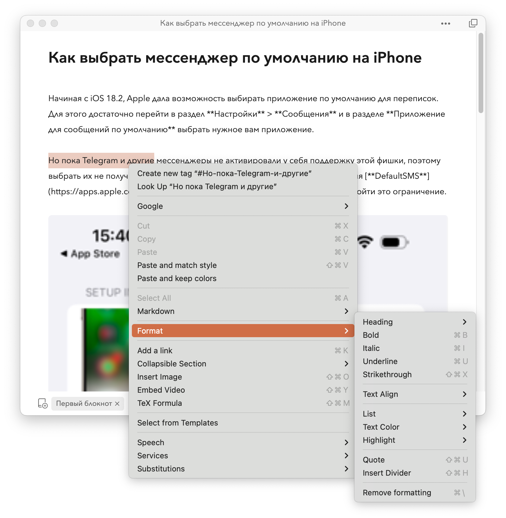 При этом если открыть заметку в отдельном окне, панель форматирования пропадёт (её можно открыть при необходимости). Через контекстное меню можно будет изменять форматирование, но часть пунктов просто недоступна, часть разбросана по нескольким меню.