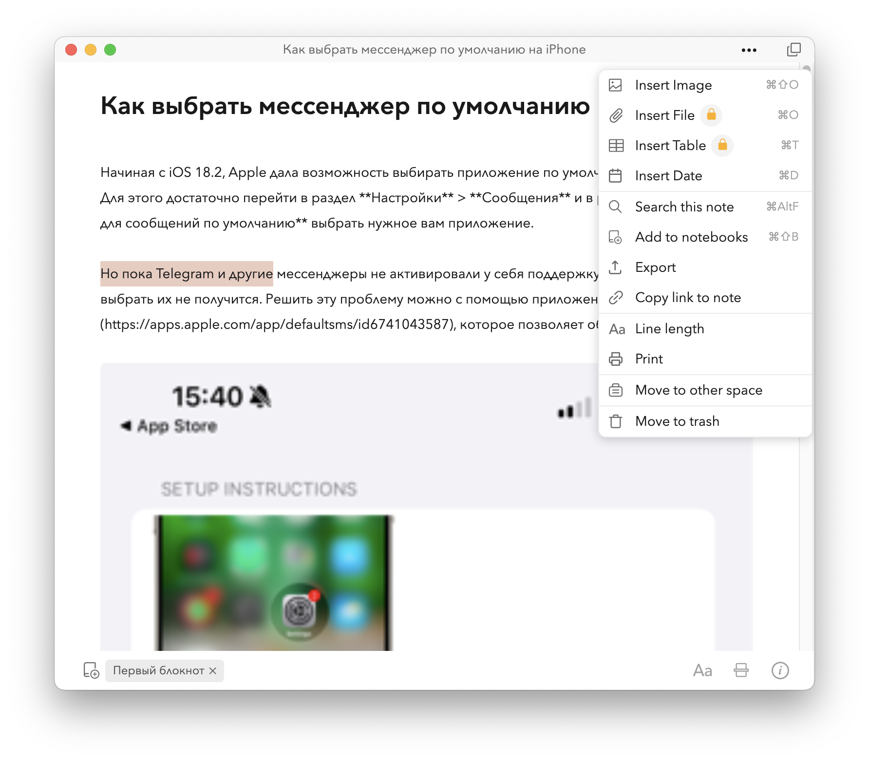 А ещё есть меню «...», которое вызывает совершенно разные пункты форматирования, если заметка открыта в приложении или в отдельном окне.