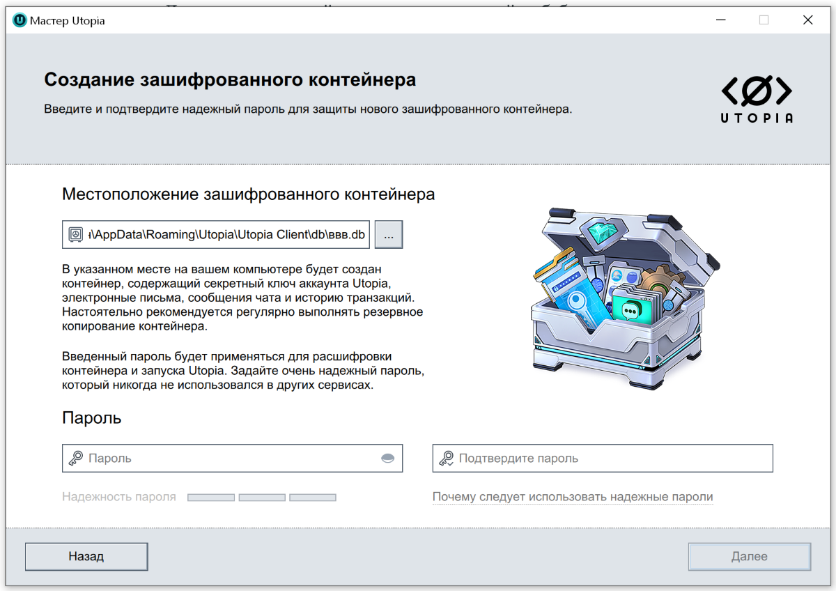 На последнем шаге от вас попросят указать путь, где будет храниться зашифрованный контейнер и логин-пароль. Файл контейнера, логин-пароль и закрытый ключ шифрования нужно сохранить в животике.