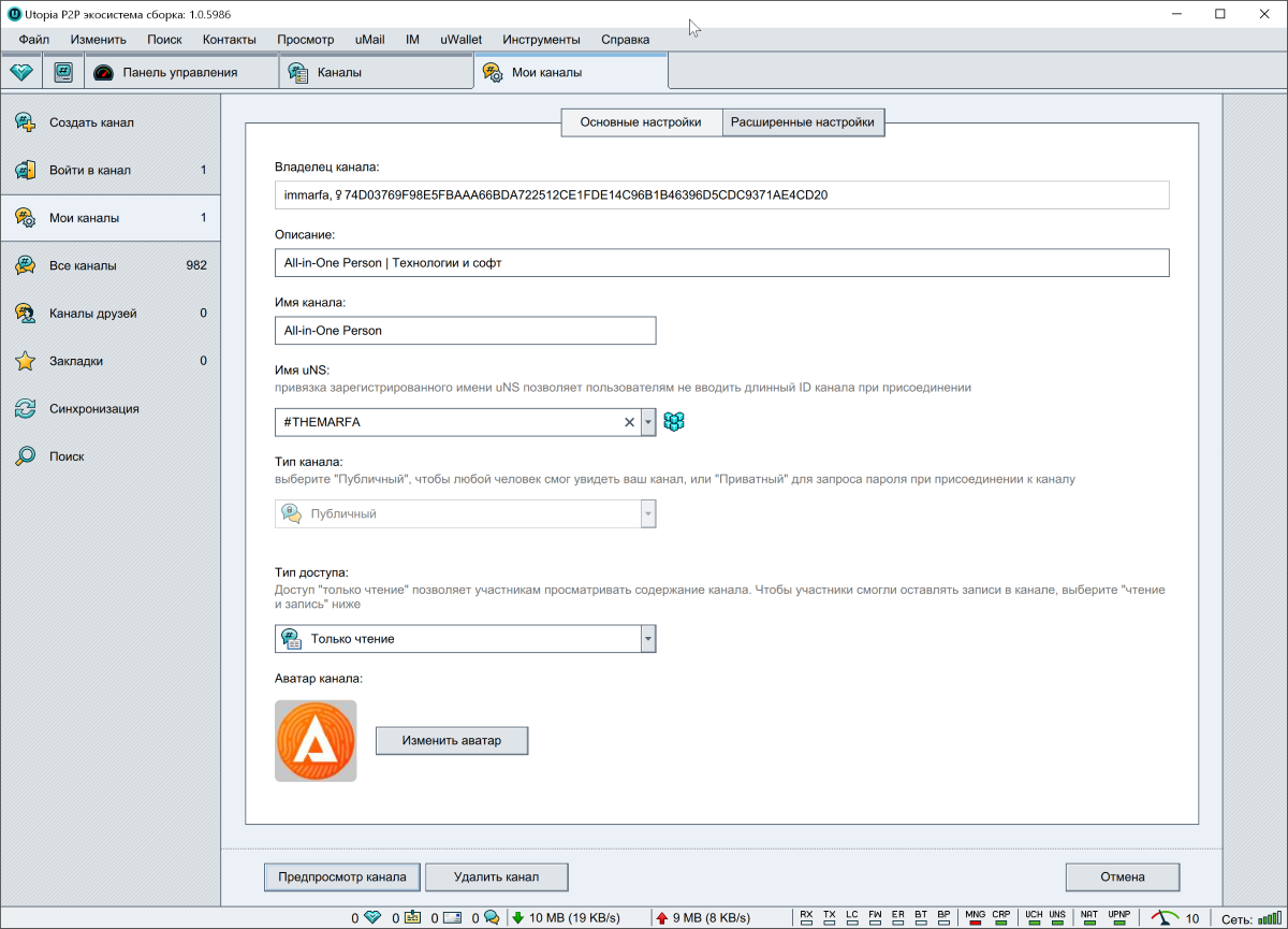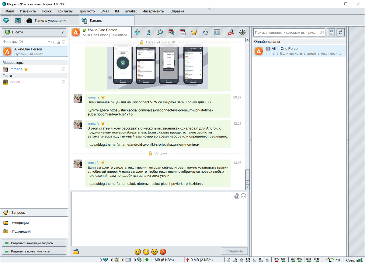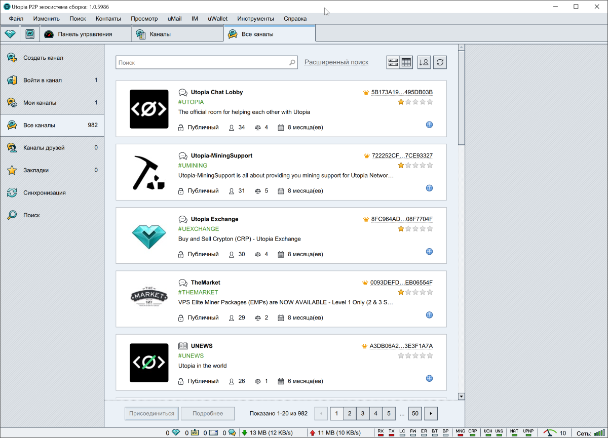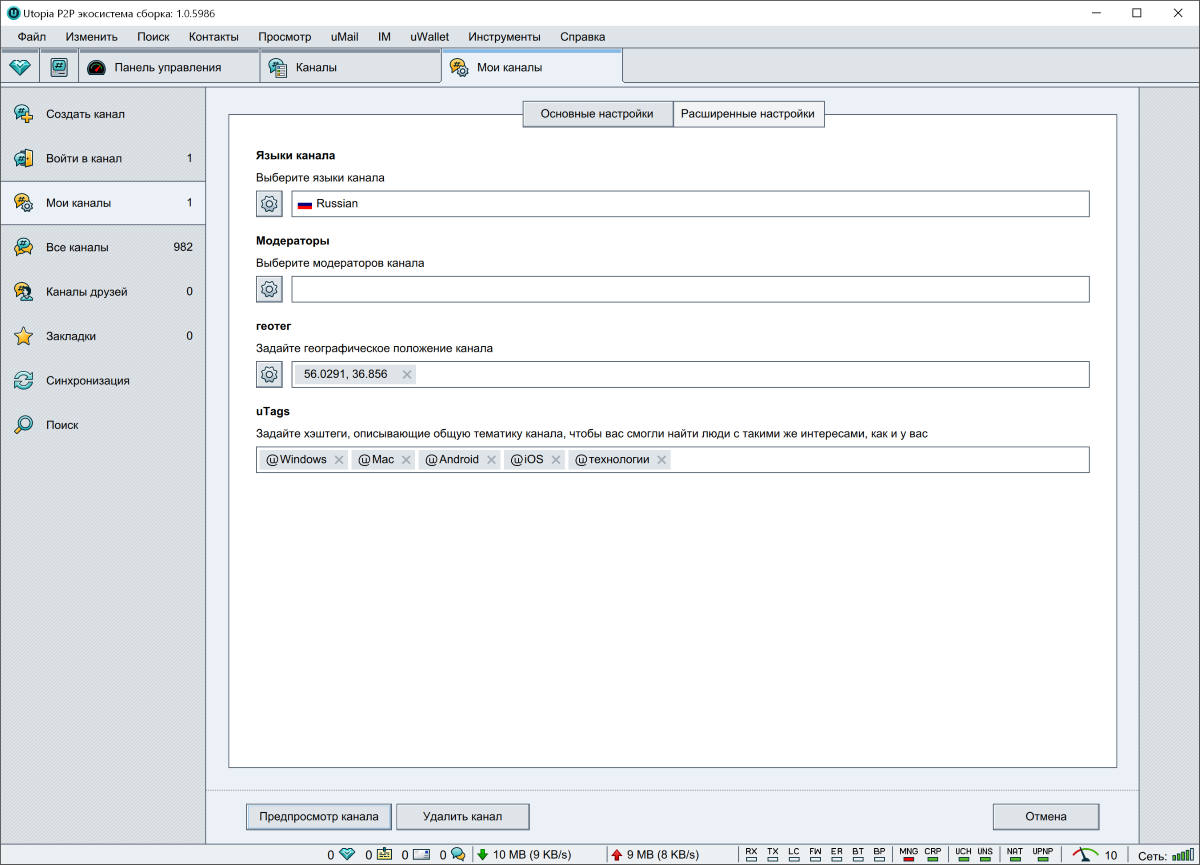 Отсюда же можно перейти к управлению каналами, именами uNS, к менеджеру файлов, ботам, играм или картам.