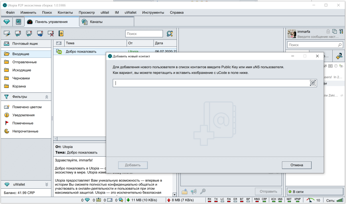 Важно отметить. Utopia не поддерживает отправку сообщений пользователям, которые не в сети. Сообщение будет висеть в неотправленных до тех пор, пока вы оба одновременно не будете онлайн. C'est la vie для пользователей этой экосистемы.