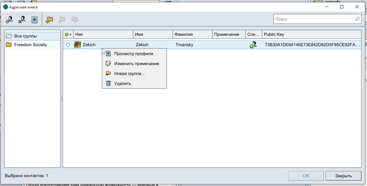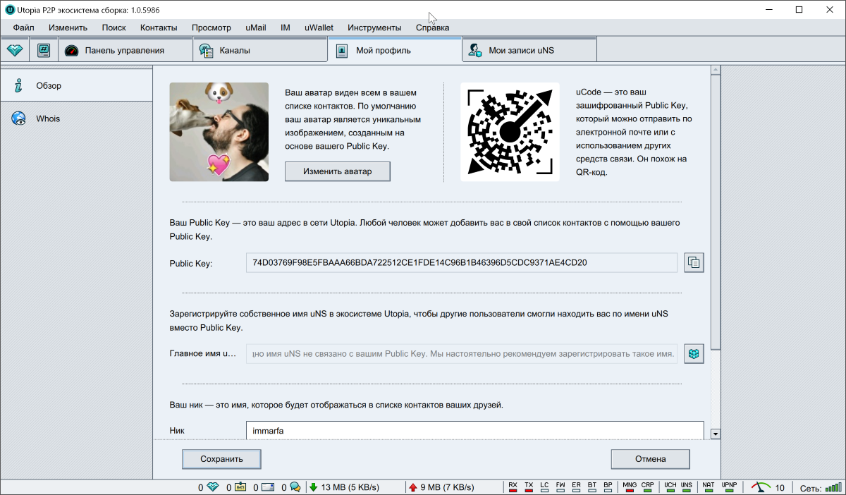 Посмотреть ваш ключ шифрования и настроить профиль можно в меню Файл > Мой профиль. Настроек не так уж и много: аватар, uNS, ник и имя с фамилией.
