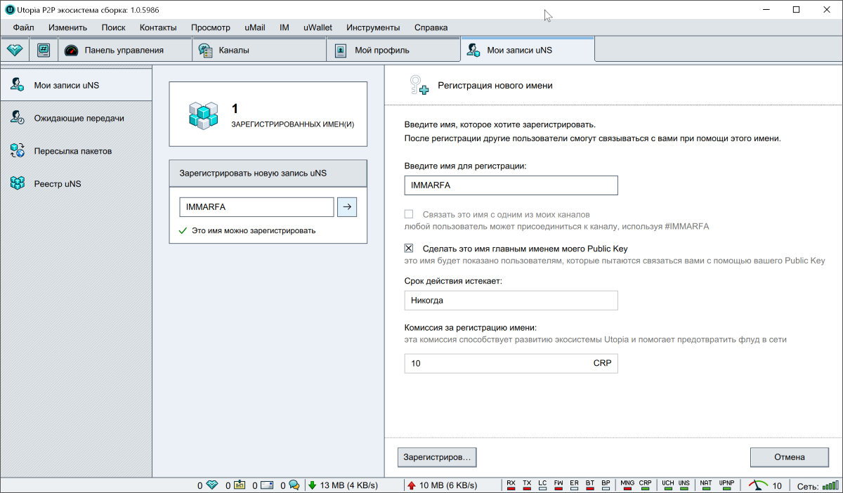 Здесь важно отметить, что для регистрации uNS требуется Crypton. Без него ничего не получится. Стоит удовольствие 10 местных единиц денег.