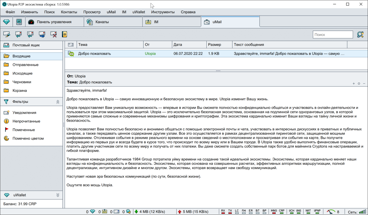 Utopia доступна пользователям на Windows, macOS и Linux. Она предоставляет весь необходимый набор сервисов для современного пользователя.