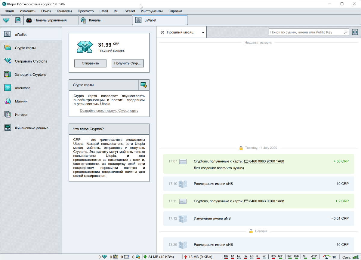 Здесь же хранятся Crypto-карты и uVoucher. Крипто-карта — это местный аналог кредитки, а uVoucher, по сути, — код, чтобы подарить кому-то криптоны.