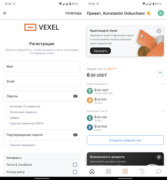 Мне очень понравилась банковская составляющая Vexel и общая дружелюбность приложения. В приложении без труда разберётся даже новичок, чему способствует лаконичный дизайн, русский язык и отзывчивая техническая поддержка.