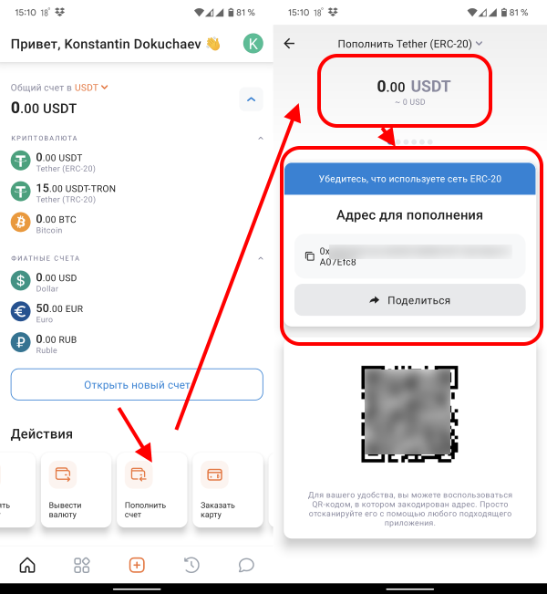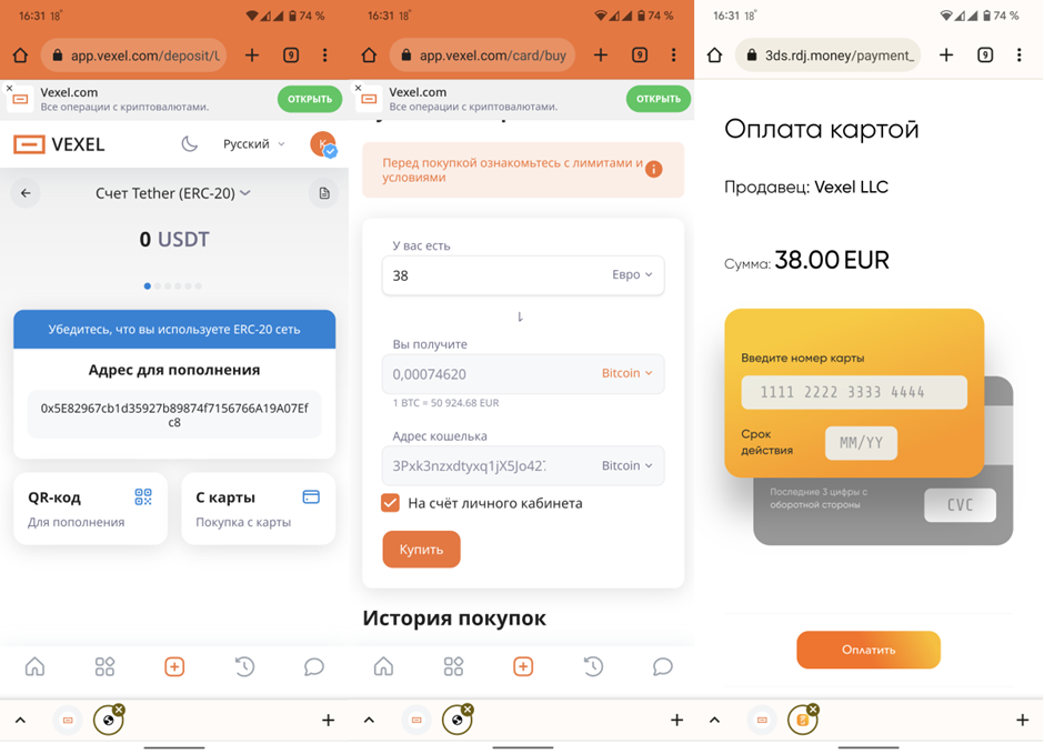 Vexel позволяет хранить криптовалюту во встроенном кошельке. А значит, пополнить свой счёт можно ей. Поддерживаются монеты LTC, BCH, DASH, ETH, USDC и, конечно, USDT.