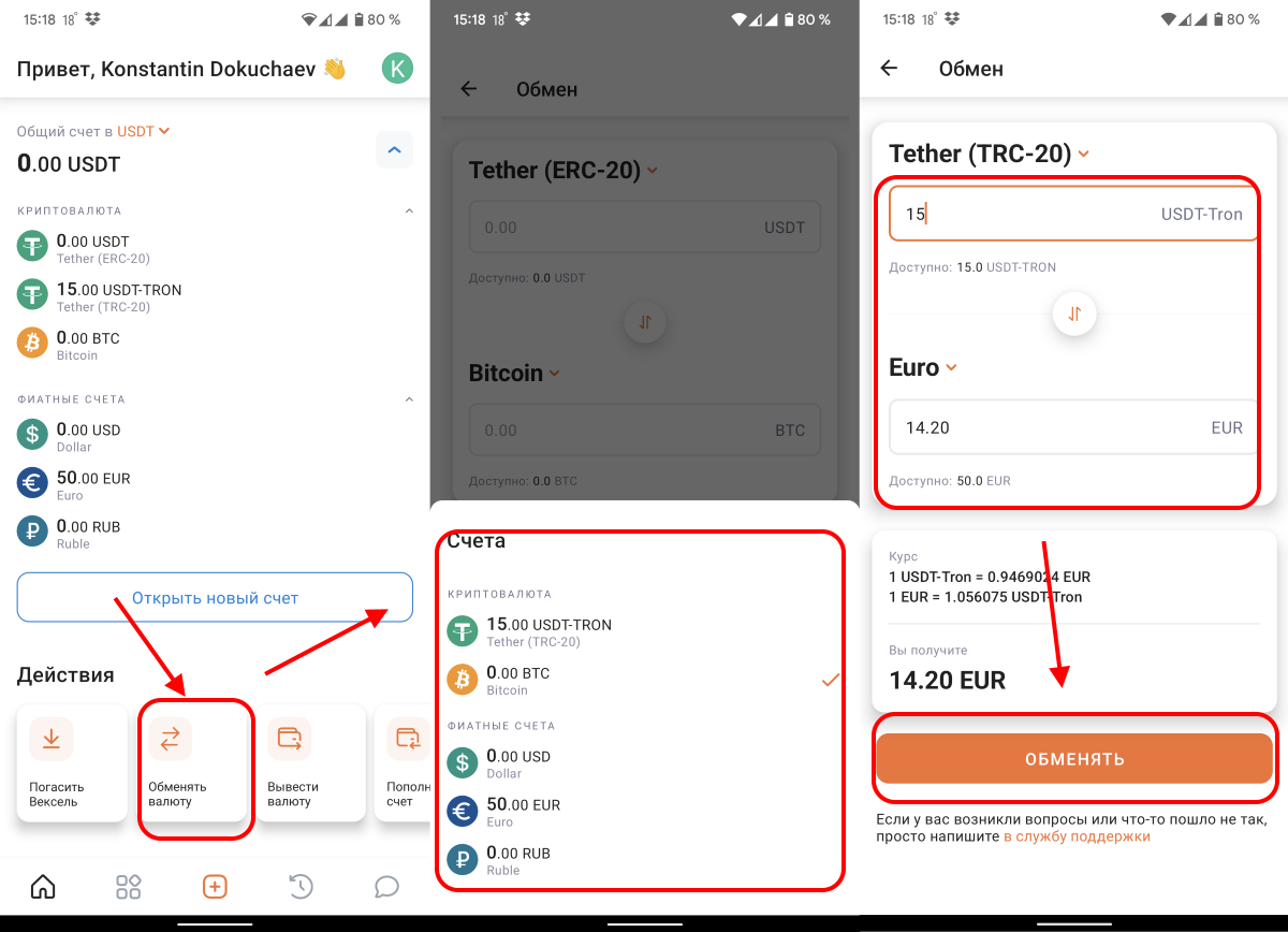 В итоге вы получаете деньги на счёт Vexel. Теперь, чтобы пополнить счёт в EURO, нужно просто произвести обмен крипты на EURO внутри самого приложения.