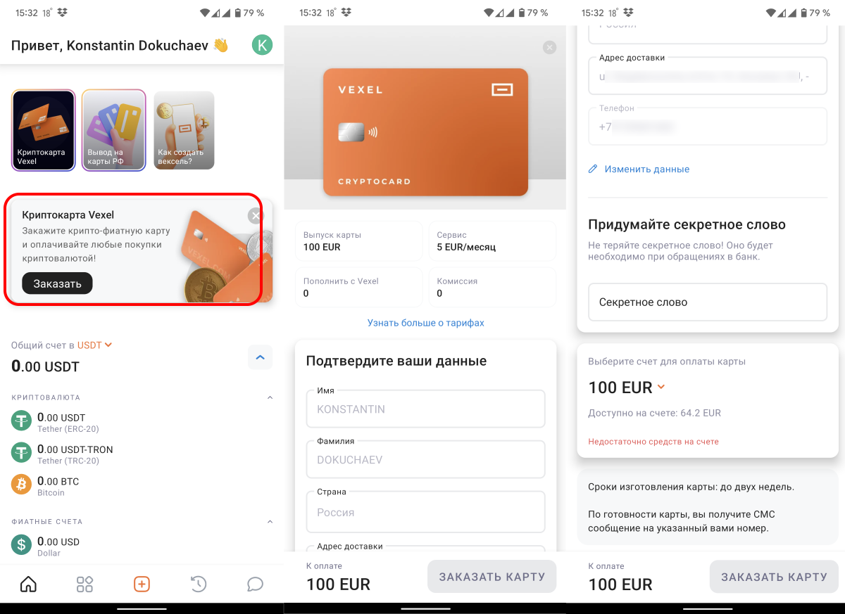 Для выпуска карты на главном экране приложения нужно нажать кнопку Заказать. После чего нужно подтвердить свои личные данные, адрес доставки, указать секретное слово.