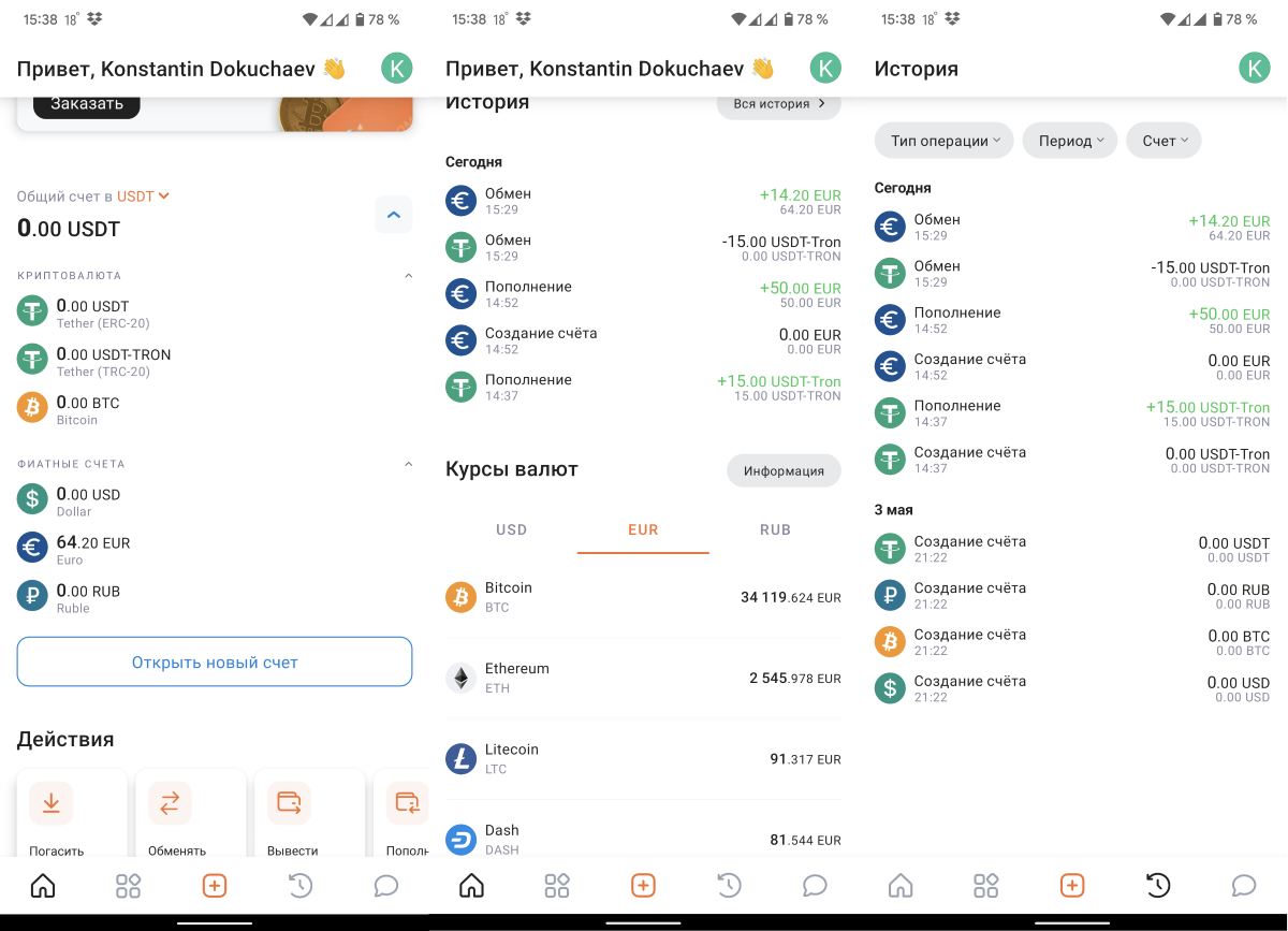 Выполнить любую операцию с деньгами так же легко, как в привычном вам банковском приложении. Возможно, даже проще. Вы можете отслеживать баланс на всех счетах (крипто и фиат), следить за курсом обмена или просматривать историю транзакций.