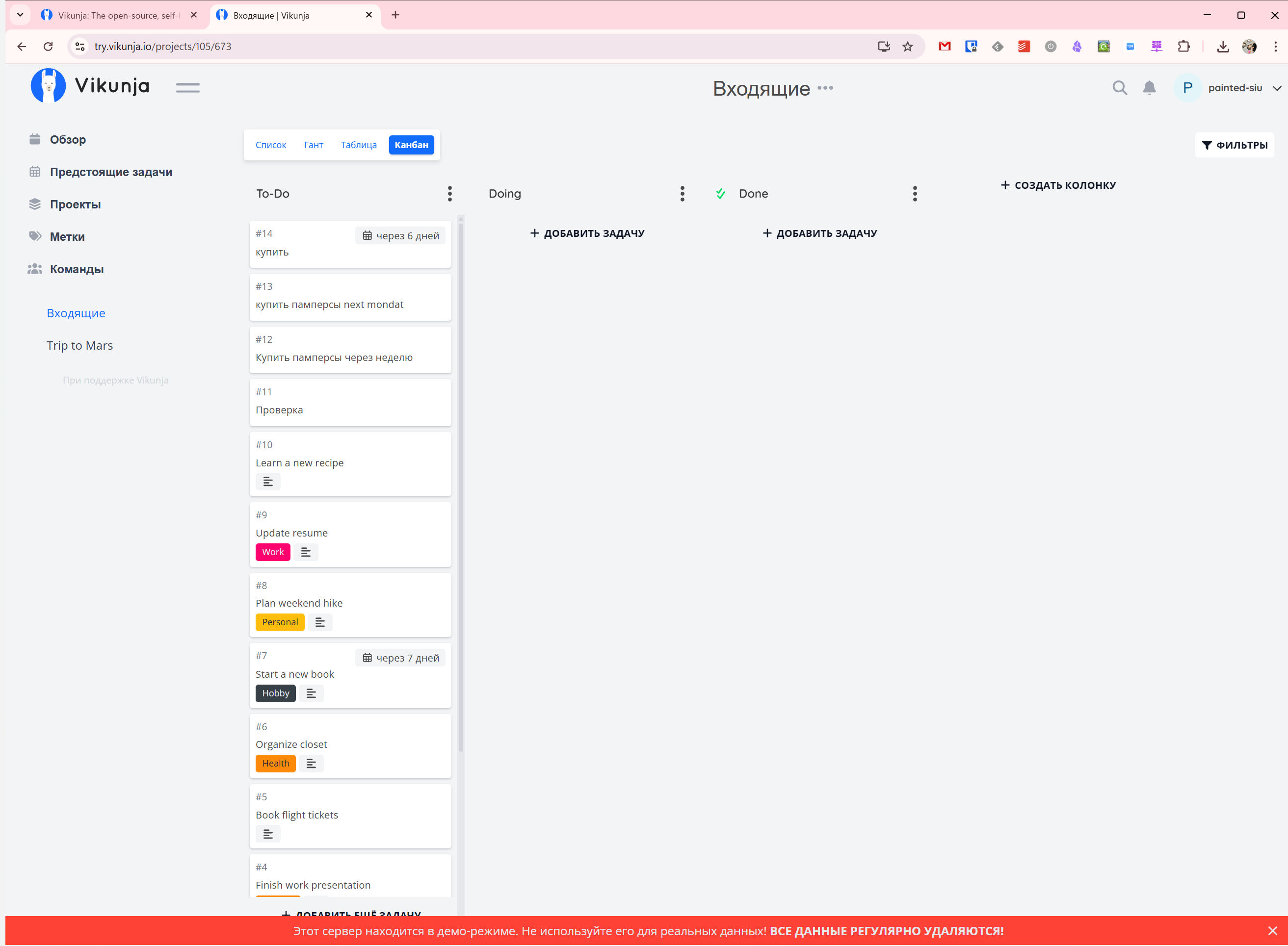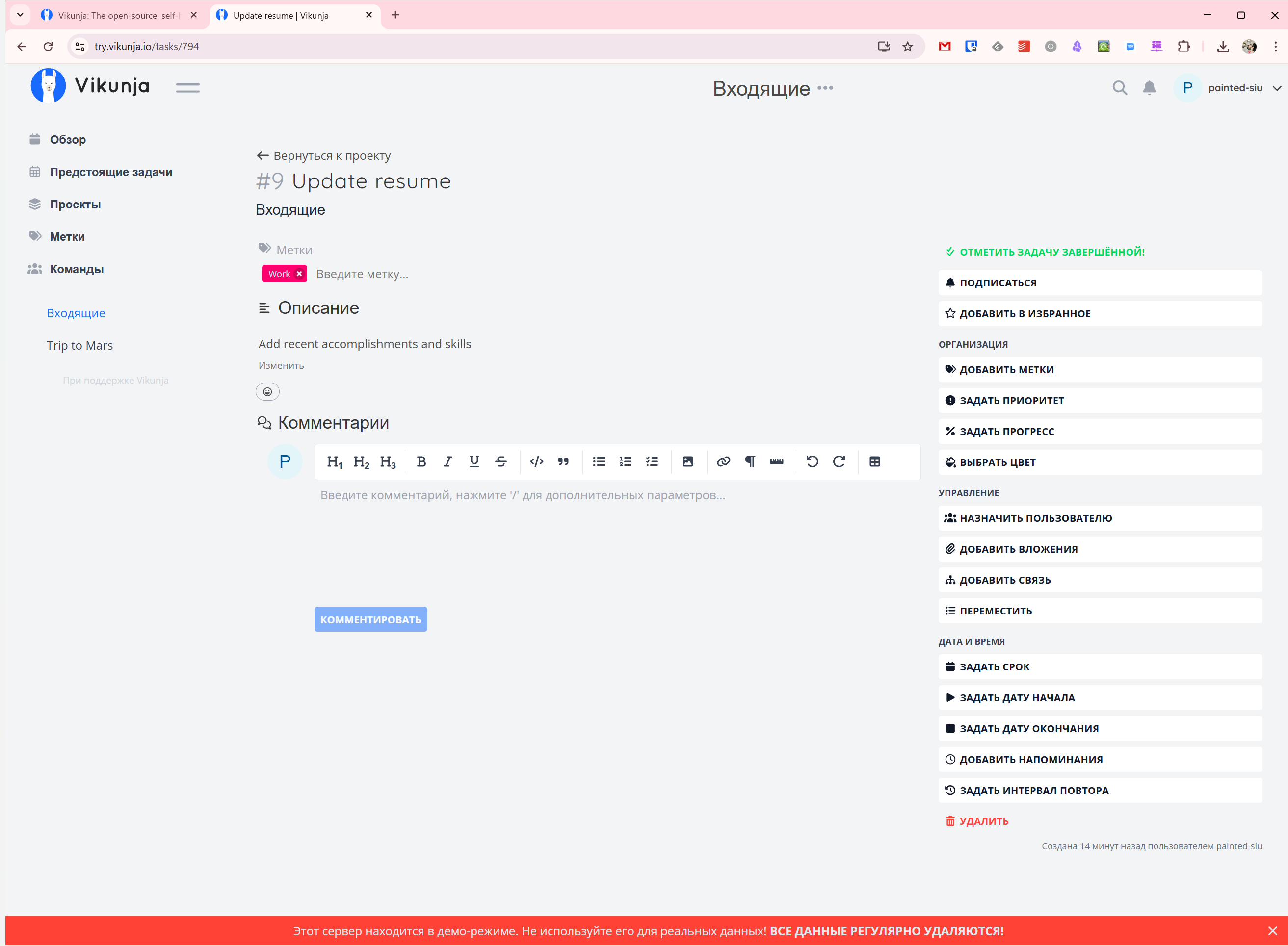Покупать платную версию Vikunja я не вижу смысла, т.к. в этом случае можно рассмотреть и другие платные альтернативы, которые поддерживают естественный ввод на русском языке и предлагают тот же набор фишек.