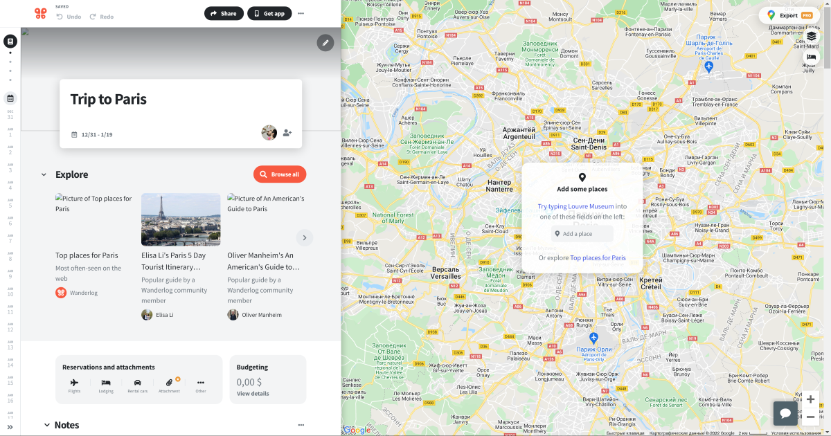 Во-первых, он бесплатный и не содержит вообще никакой рекламы. Во-вторых, он разрешает делиться планами поездок с друзьями или коллегами (при этом вы сможете задавать права доступа — только для просмотра или для редактирования). Надо сказать, что все изменения, внесённые кем-то из ваших друзей, будут видны сразу же. Ну и в-третьих, оно имеет приятный интерфейс и удобно в использовании. Также отдельного внимания заслуживает то, что Wanderlog доступен в виде приложений для Android и iOS, а также в виде веб-версии. Для примера возьму второй вариант.