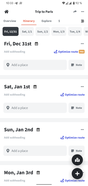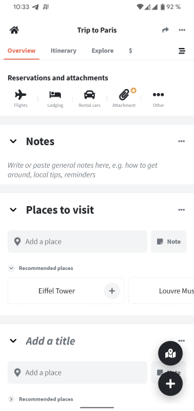 И последний раздел — Itinerary. Он поможет буквально по дням спланировать вашу поездку. Места, которые вы хотели бы посетить, текущие бронирования — всё это будет показано здесь. Плюс, к каждому плану вы сможете указать конкретное время и добавить заметку.