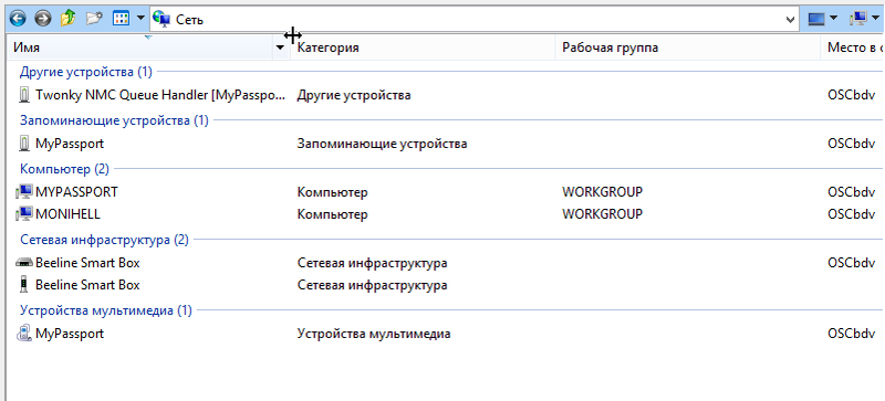 После успешного подключения к сети все ваши телефоны, планшеты и компьютеры будут иметь доступ к диску. Одним из преимуществ My Passport является то, что он отображается в Сетевых устройствах ПК и как сетевая папка, и как устройство мультимедиа, и как запоминающее устройство:
