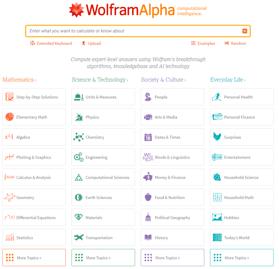 Wolfram|Alpha — поисковик для самых различных вычислений по математике, науке, технологиям, обществу, культуре и многому другому.