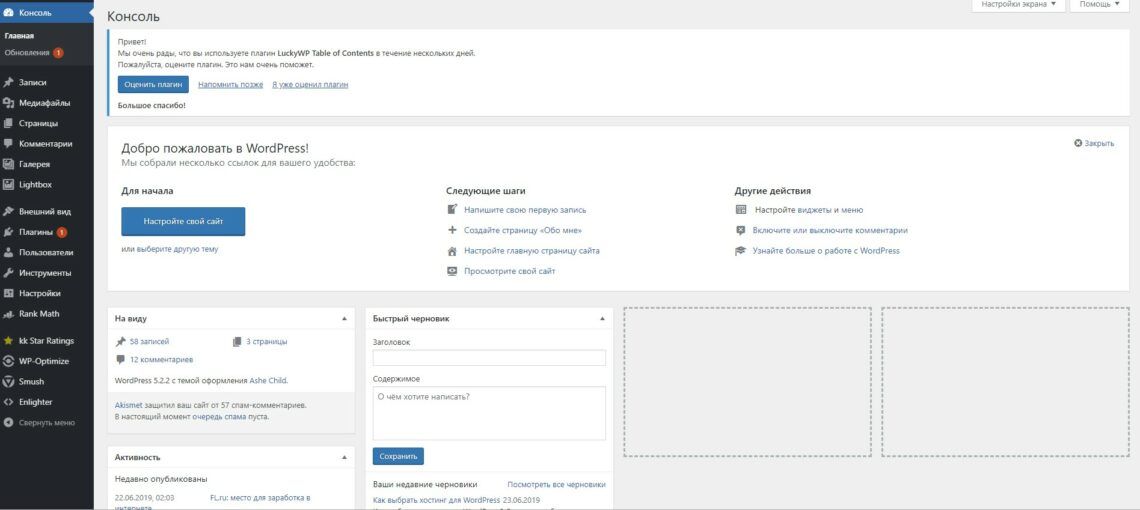 Теперь перейдите в админ-панель (консоль управления сайтом), и можно прямо сразу начинать публиковать веб-страницы и посты. Для работы с контентом предлагается целых три редактора — продвинутый блочный Гутенберг, инновационный Elementor и классический WYSIWYG с переключением на редактирование кода.