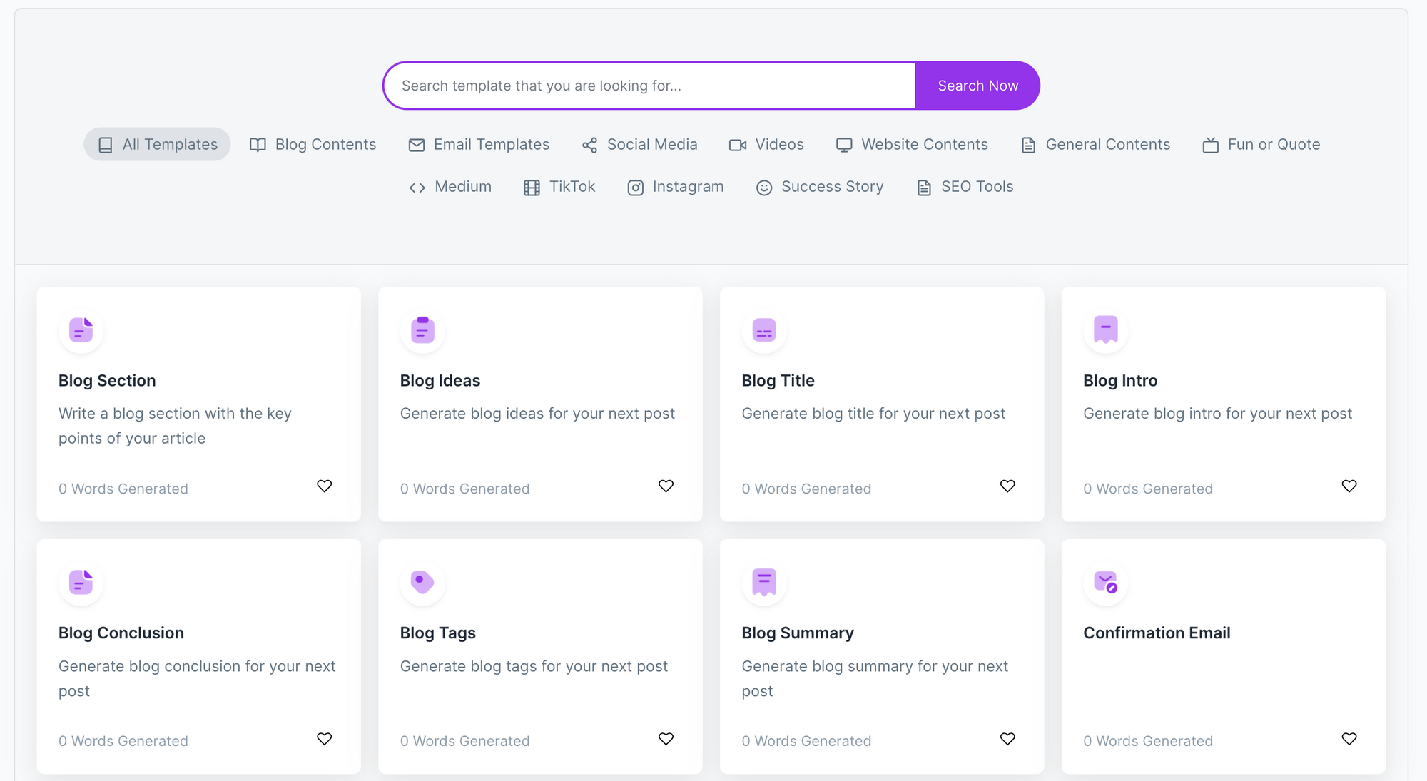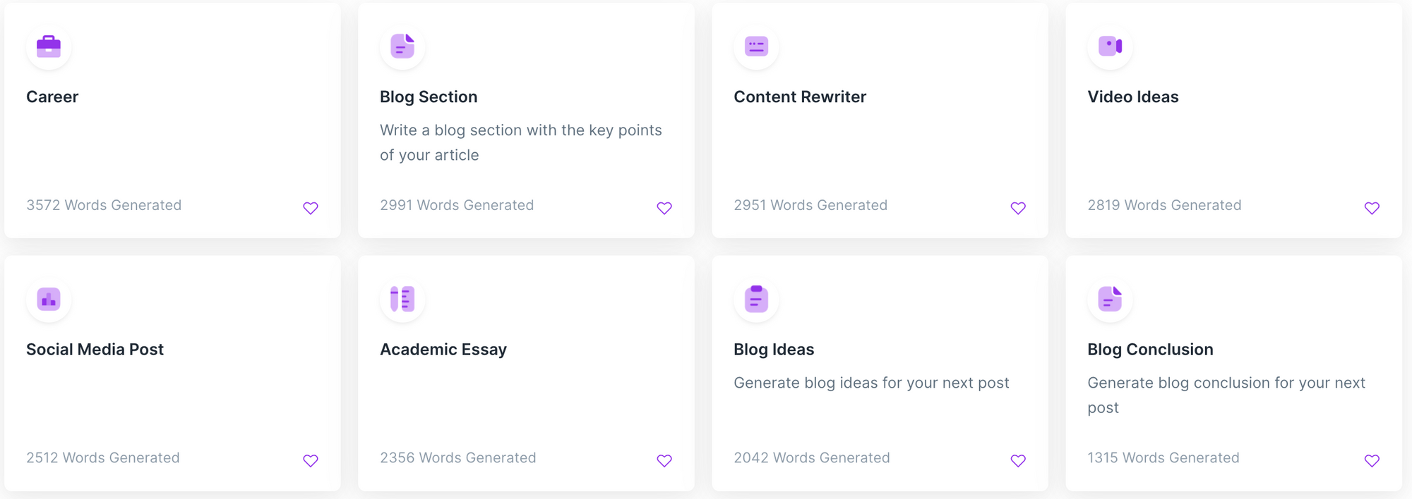 Здесь можно выбрать шаблон для текста, который вы хотите сгенерировать. Есть шаблоны для блога, почты, соцсетей, видео и прочего.