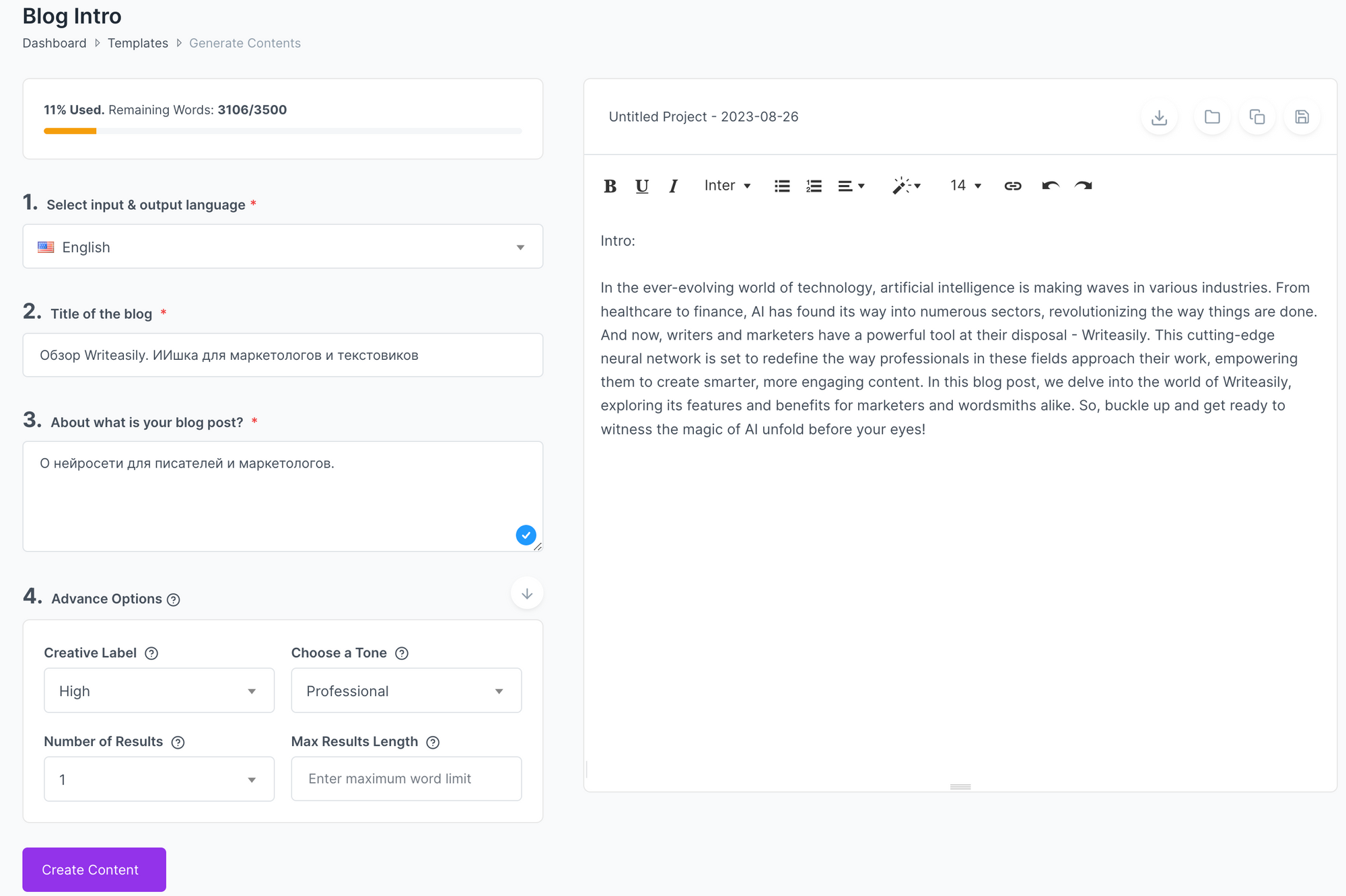 Writeasily — онлайн-сервис, который нацелен на помощь в написании рекламного и статейного контента по различным тематикам: от постов в блог до TikTok.