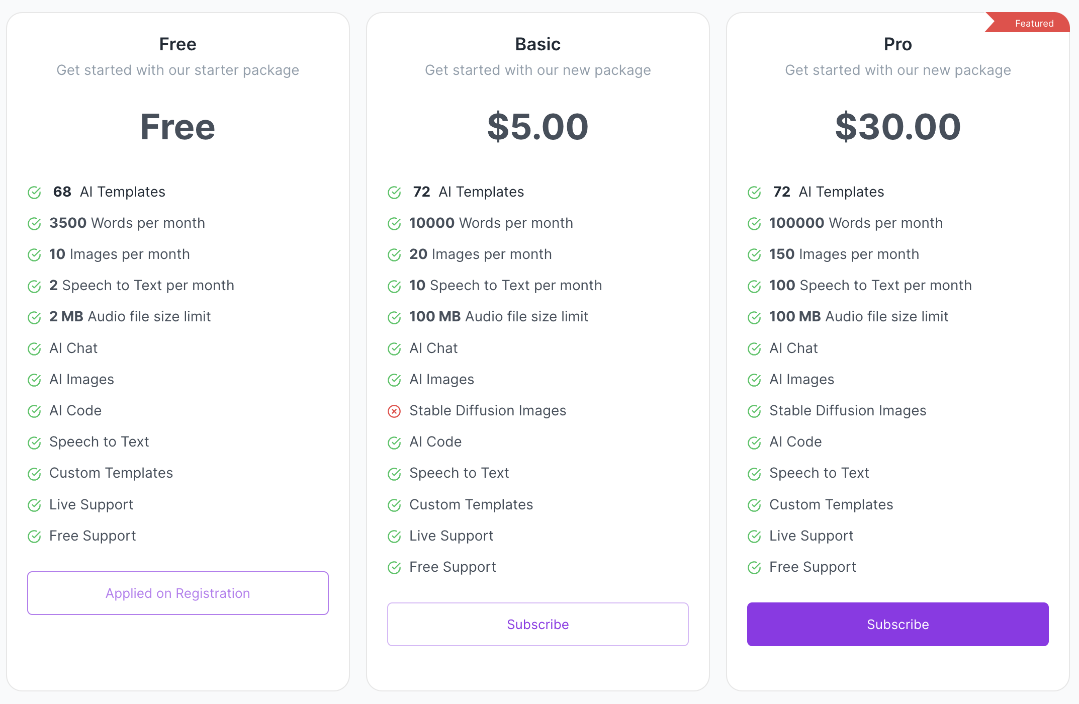 Writeasily предлагает три тарифа на выбор, включая бесплатный. Основные отличия между ними в количестве шаблонов, слов, картинок и прочего для генерации в месяц.