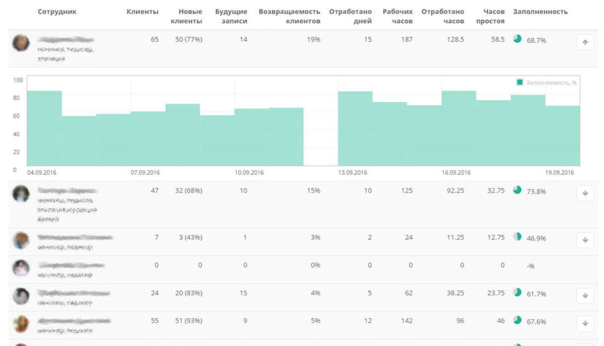 Для этого в системе есть более десяти различных аналитических отчётов: востребованность персонала и услуг, эффективность персонала, анализ клиентов и многое другое.