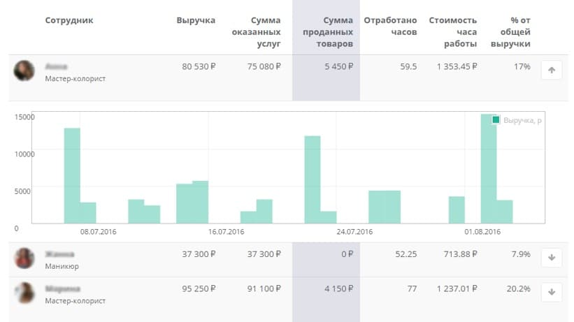 Вы легко сможете проанализировать основные показатели работы салона или каждого сотрудника по-отдельности, а также проанализировать эффективность тех или иных услуг.