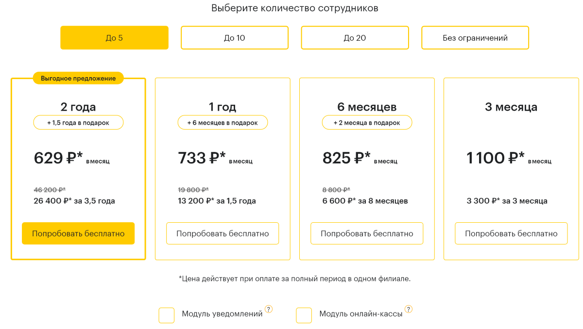 При добавлении модулей онлайн-кассы или уведомлений цена возрастёт. За мобильное приложение придётся платить по 40 000 рублей в год. Любой из тарифов можно попробовать бесплатно.