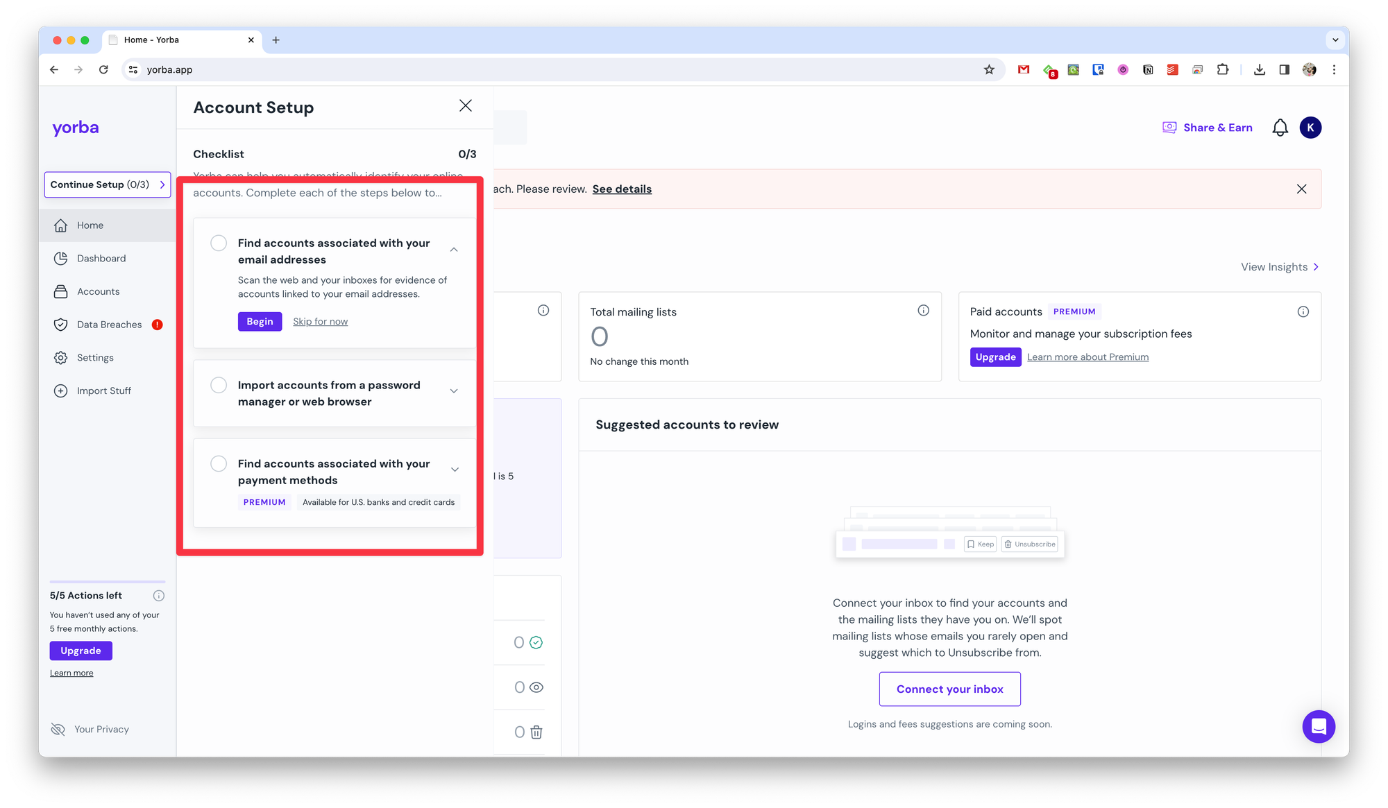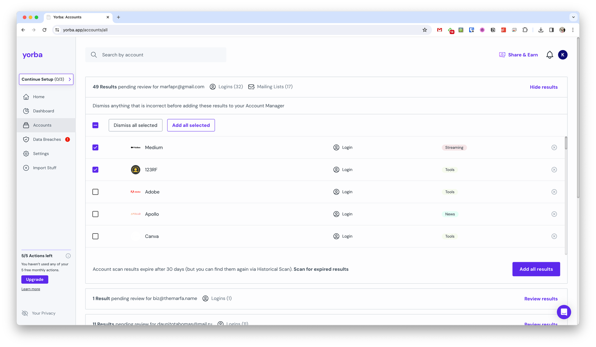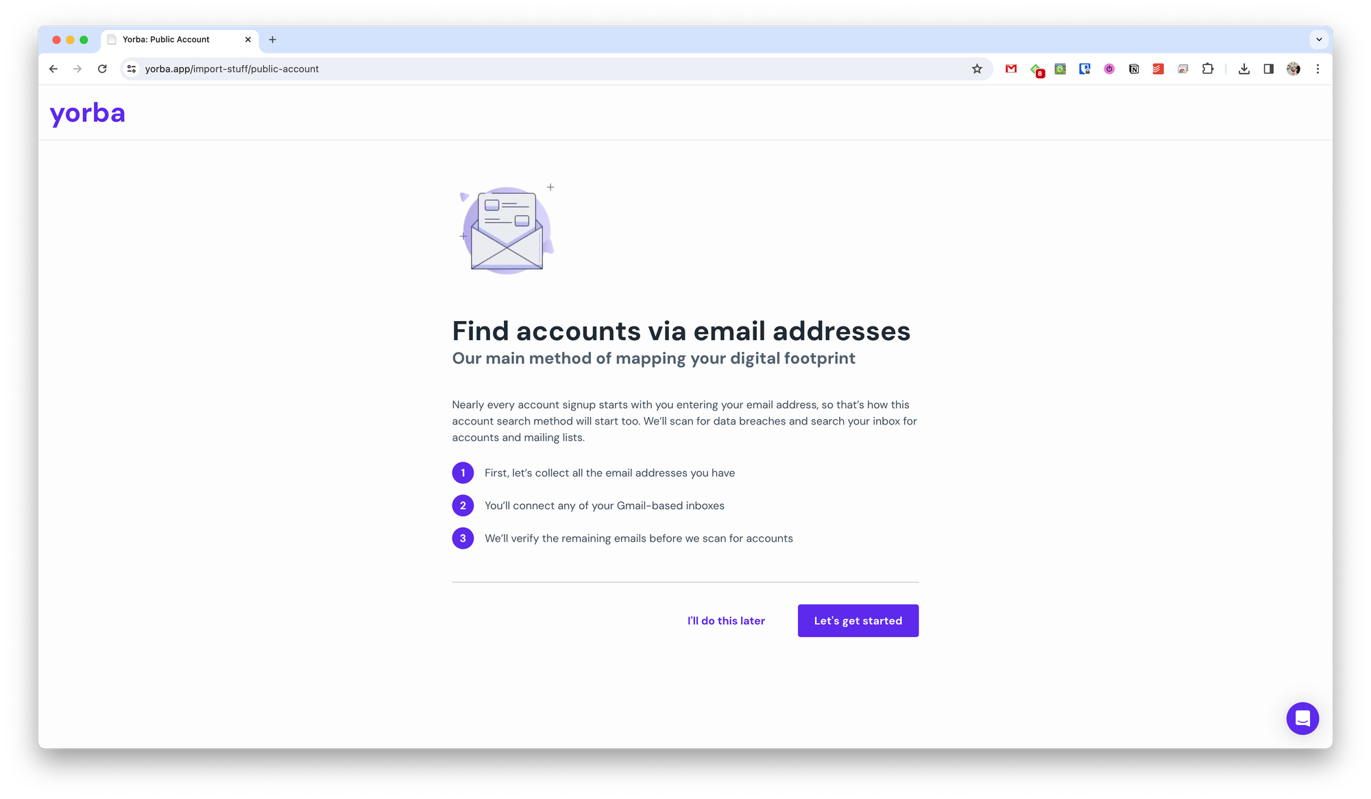 На каждом из шагов этого чек-листа Yorba произведёт соответствующий поиск данных и при необходимости запросит от вас какие-то дополнительные данные. Например, при поиске ваших учёток вам нужно будет предоставить остальные почтовые адреса.